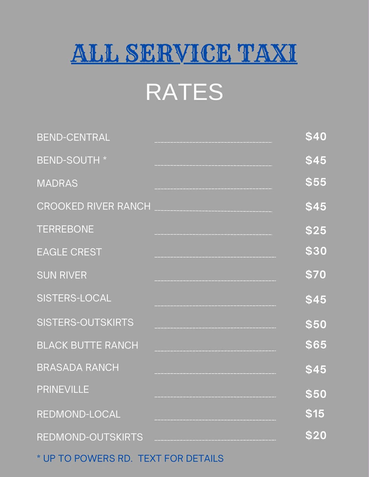 I have enjoyed serving the community for over 8 years. I love getting to know different people from all over the world and sharing the beauty of central Oregon. My wife Ashley and I care for the growing transportation needs of the area. We are so thrilled to call Oregon home and share this journey together. We hope to see you soon!